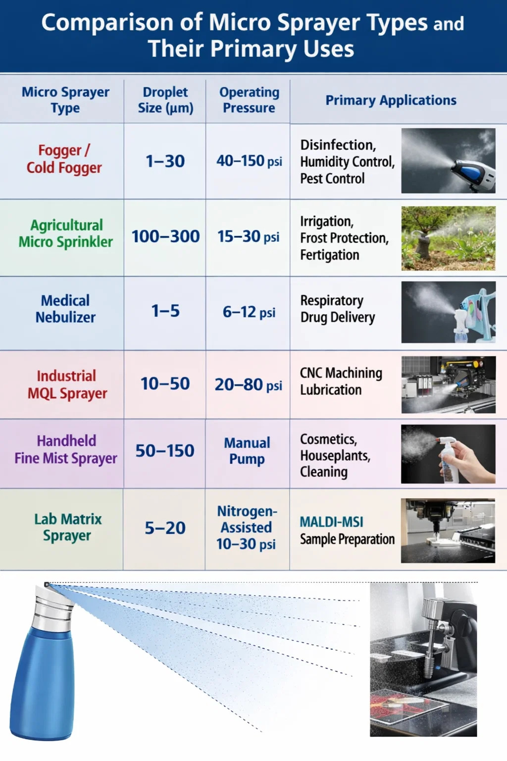 Tá cumraíochtaí éagsúla micrea-spraeire optamaithe le haghaidh feidhmeanna sonracha. Nuair a roghnaítear an cineál mícheart bíonn droch-chlúdach, ábhar amú, nó damáiste trealaimh. Tugann an tábla thíos achoimre ar na cineálacha micrea-spraeire is coitianta, a ngnáthmhéideanna braoiníní, brú oibriúcháin, agus cásanna úsáide is fearr.