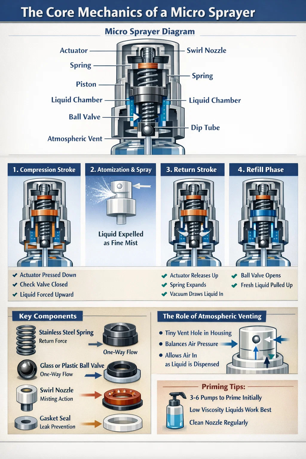An bunúsacha prionsabal oibre micrea-spraeálaí bunaithe ar dhíláithriú brú leachta agus atmaisféir, ag baint úsáide go sonrach as a meicníocht caidéil díláithrithe dearfach . Nuair a bhíonn an actuator depressed, comhbhrúiteann sé earrach agus laghdaítear an toirt taobh istigh de chuasán beag, ag brú leacht amach trí bhuaic bheachtais. Nuair a scaoiltear é, tarraingíonn an earraigh an loine ar ais, ag cruthú a bhfolús a tharraingíonn leacht úr as an mbuidéal tríd an bhfeadán tumtha chun an seomra don chéad spraeála eile a athlíonadh.